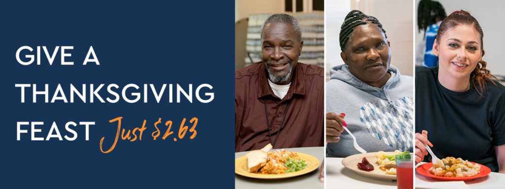 Your generous gift now will provide a comforting Thanksgiving feast for a guest at our table… and that meal is often the first step toward a new life! A hot, nourishing meal is only $2.63. For a lonely senior… a struggling family… or hurting guest, a Thanksgiving meal nourishes them body and soul. Your gift at Thanksgiving also leads to more life-transforming services like these:- Safe, clean shelter