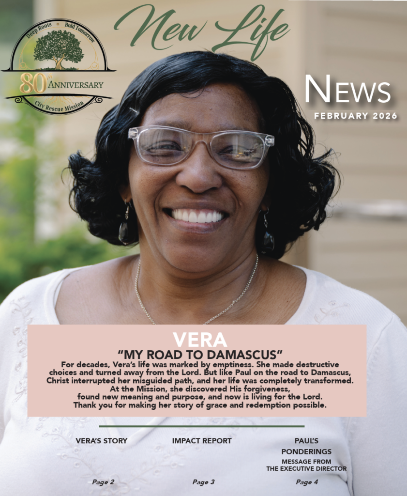 Determined to change before it was too late, she quit her job and began researching treatment facilities. She was accepted by one in South Carolina, but as she prepared to leave, the arrangement fell through. Then she called City Rescue Mission. “And that’s where I ended up,” she says. Like Paul’s story, she knew God had intervened in her plans and guided her to a place of redemption.